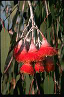 Pass by the group of grass trees, Xanthorrhoea sp. [Section 60] with long flowing grasslike leaves, across the bridge to view flowers in the Ellis Rowan garden. Banksia ‘Birthday Candles’ [Section 244] is a dense dwarf plant with upright cylindrical golden flower spikes and Banksia ‘Stumpy Gold’ [Section 131] is more upright with a wide spread with flower spikes of its own shade of gold. Epacris longiflora [Section 131] is close by with long red tubular flowers tipped with white clings to various branches.