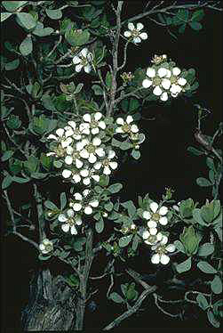 Spreading shrub to 1 m high by 2 m across. Leaves are obovate, to 1 cm. Small white or rarely pale pink flowers occur in spring.